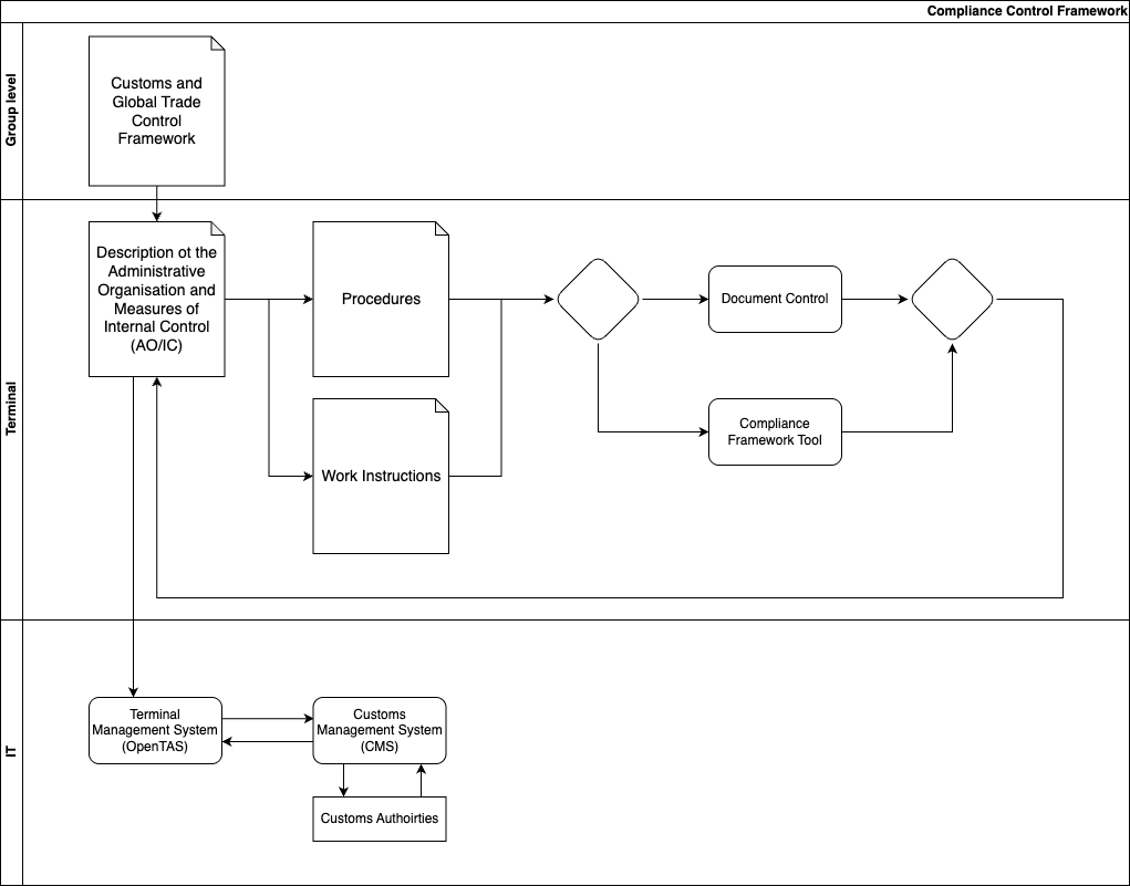 At terminal level, the Customs and Global Trade compliance control framework is structured around a clearly defined Administrative Organisation and Internal Control (AO/IC). This umbrella document outlines how the terminal is organised from a governance, staffing, and internal control perspective, ensuring that the necessary competencies, roles, and responsibilities are in place to meet all customs and excise compliance obligations.